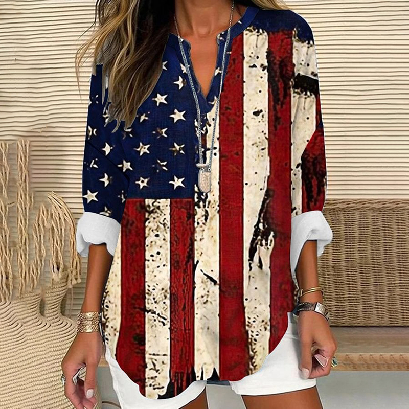 Independence Day Distressed Flag Print Casual V-Neck Blouses