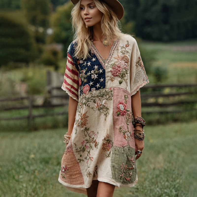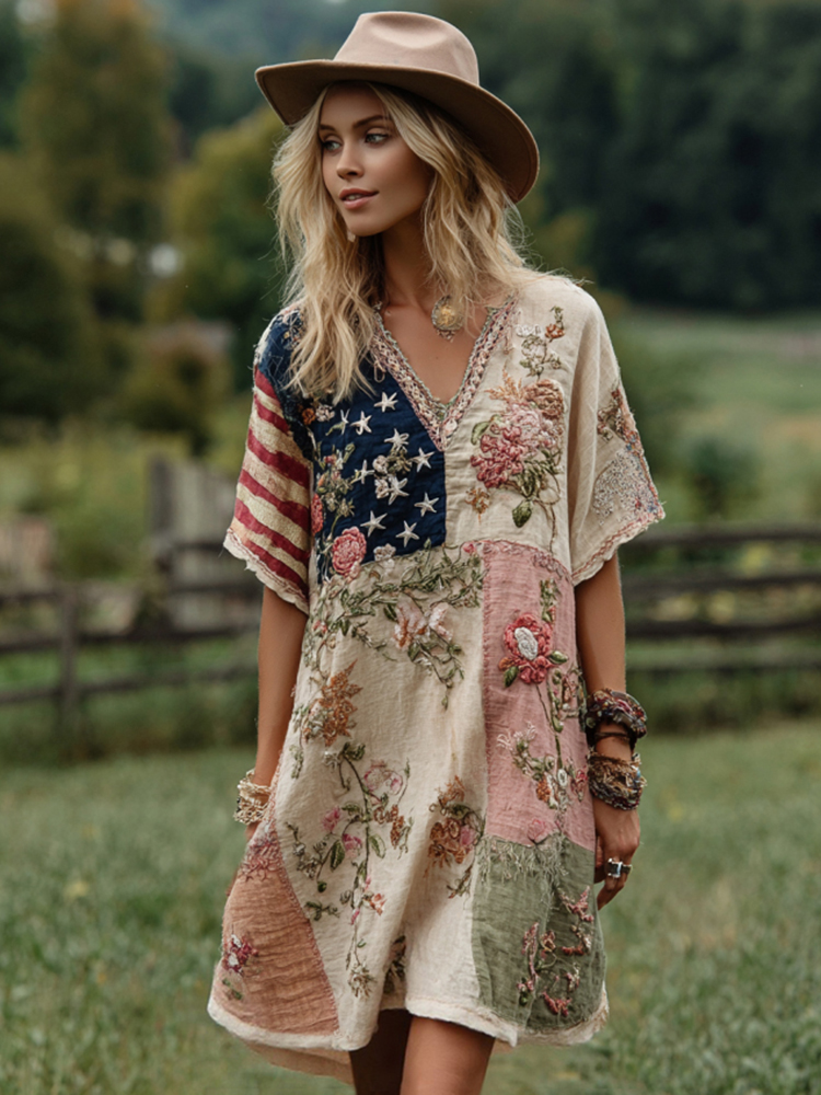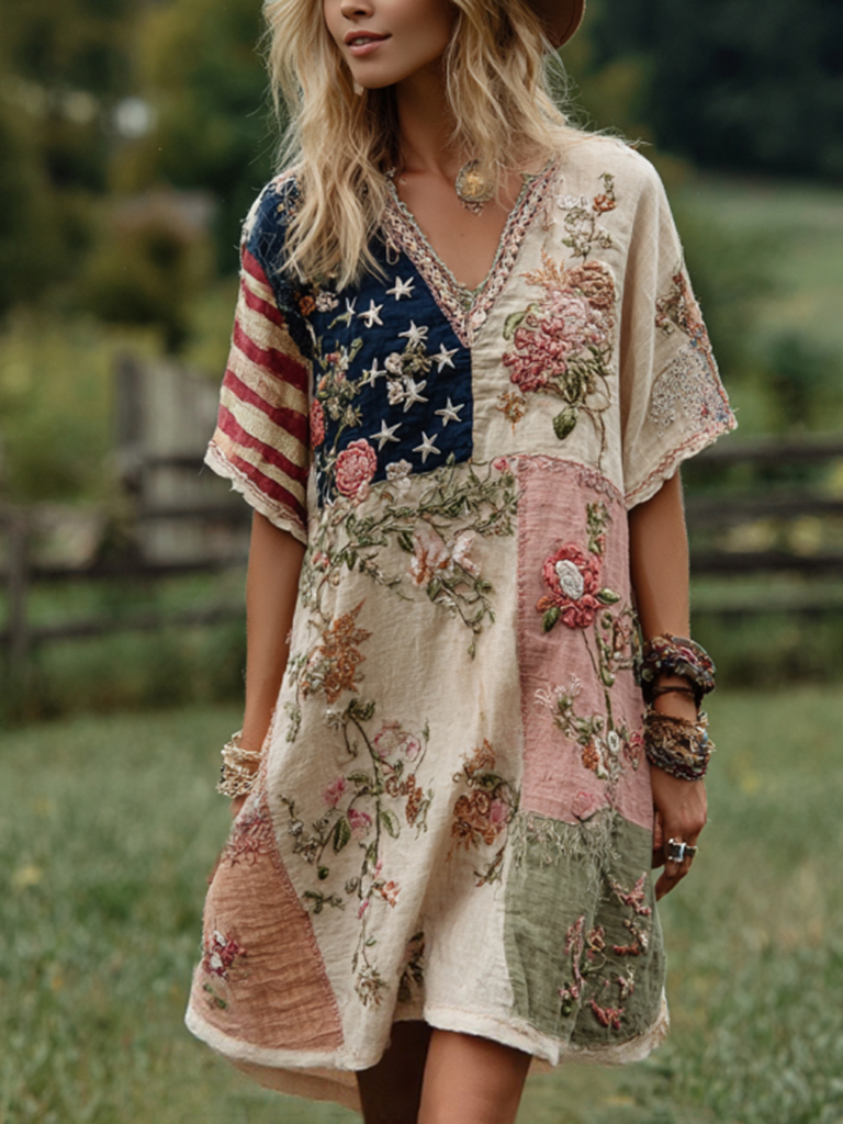 Women's art Western Country Style Floral Embroidered Patchwork Embroidered Patchwork Art V-neck Dress