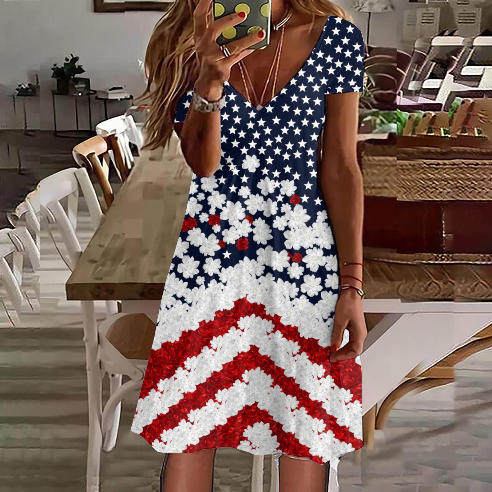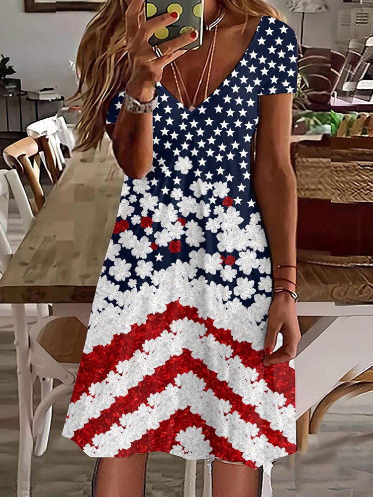 Women's Vintage Independence Day Flowers Art Short Sleeve Dress